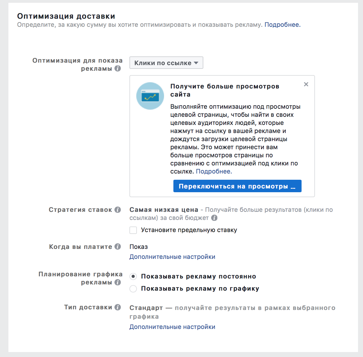 По самому названию цели можно догадаться, какая именно идет оптимизация от Facebook в данном пункте. Если вы хотите раскрутить мероприятие — можно использовать формат “ответы на приглашения”. Если нужно больше подписчиков в бизнес странице Facebook — “отметки “Нравится” страницы”