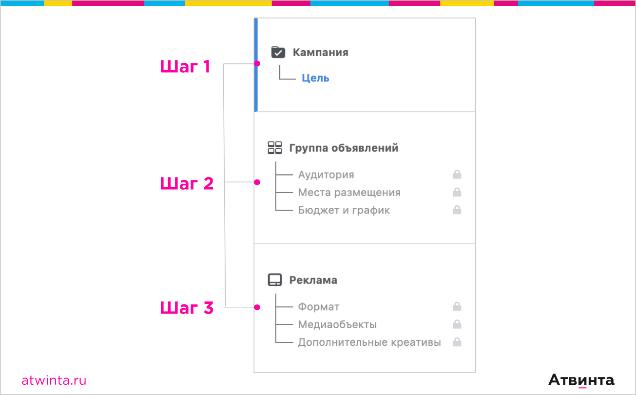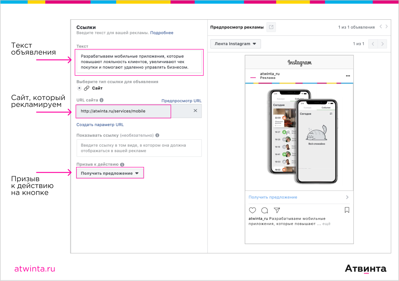 Уровень объявлений — это создание креативов: изображение, оффер, кнопка целевого действия. Здесь мы указываем адрес рекламируемого сайта.
