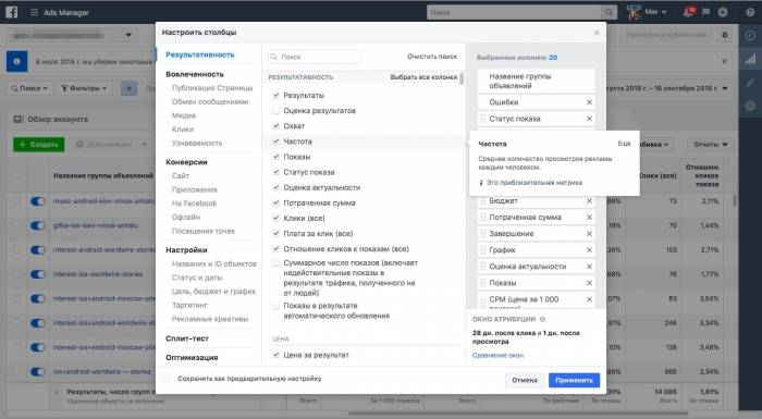 Вы можете настроить столбцы под себя, выбирая только необходимые вам метрики и создавать отчет на их основе. Для этого нажмите «Настроить столбцы» и поставьте галочки в тех местах, которые вас интересуют.