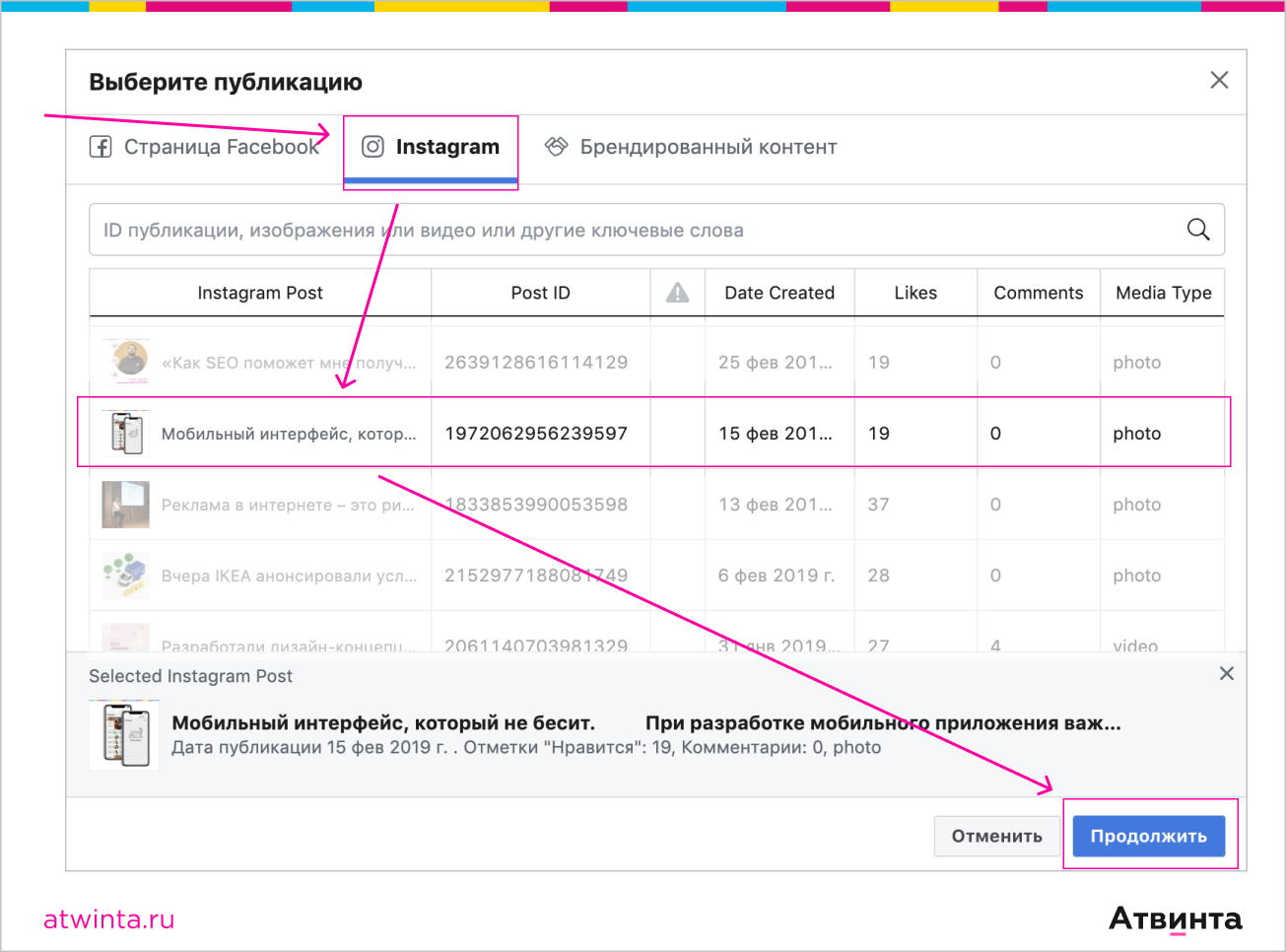 В открывшемся окне выбираем нужный пост и нажимаем «Продолжить».