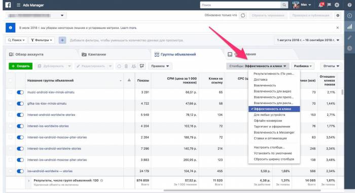 Для этого возвращаемся на главную страницу Адс Менеджера, которая отображает данные для отслеживания сотни метрик, вот некоторые из них: