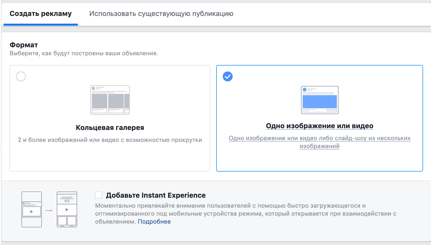 Мы остановили свой выбор на формате «Одно изображение или видео»