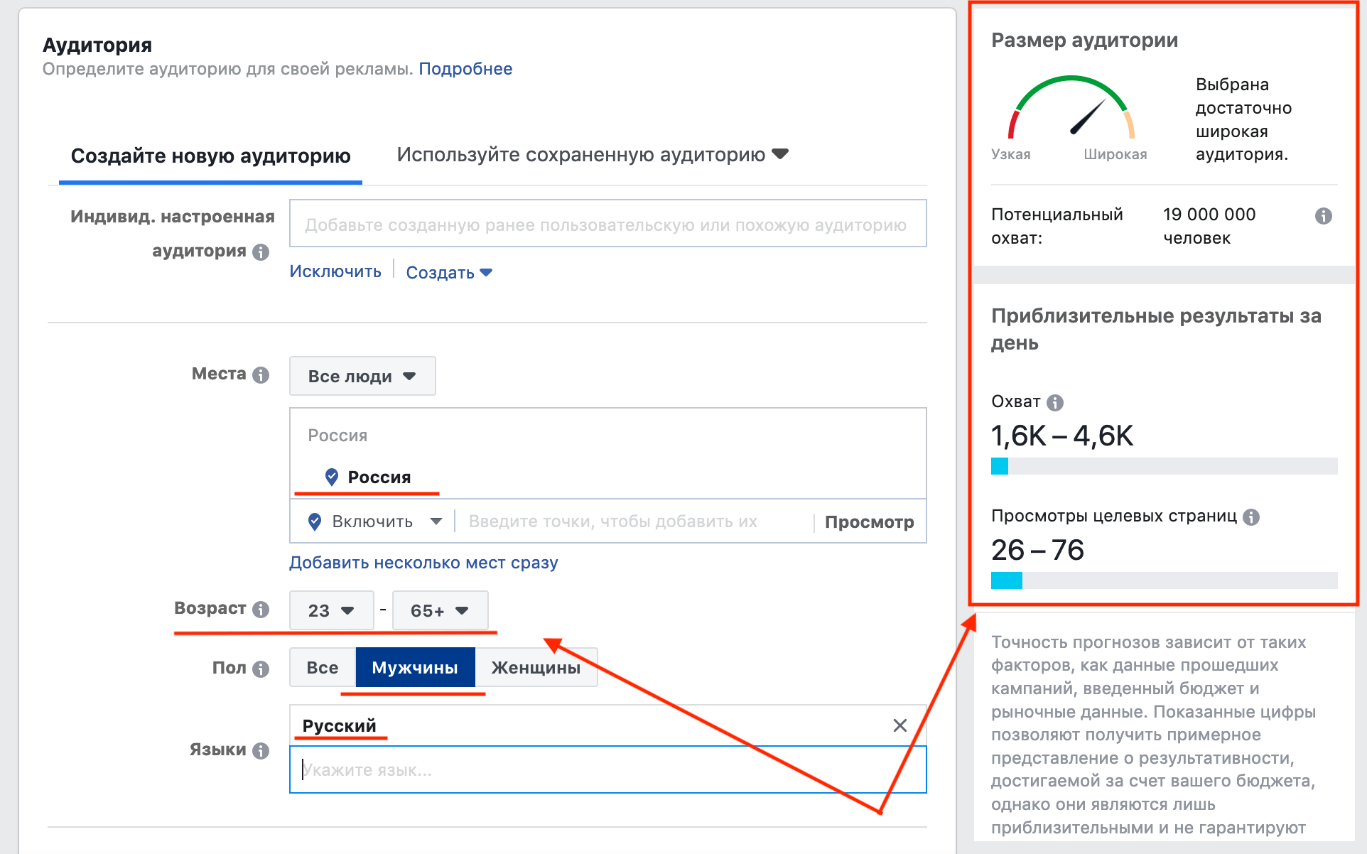 Шаг 5. Переходим к настройкам таргетинга и спускаемся в раздел «Аудитория». Здесь необходимо задать параметры аудитории для показов рекламы: