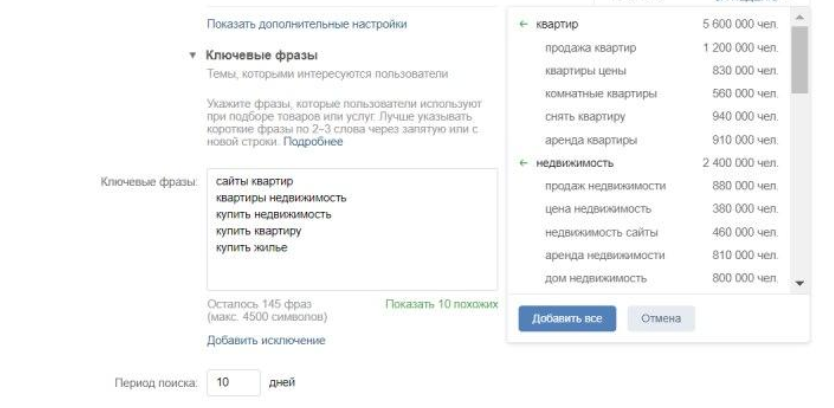Например, ранее вы таргетировались на интерес «Недвижимость», то теперь есть возможность уточнить раздел более подробными вводными — «сайты квартир», «купить квартиру», «купить жилье».