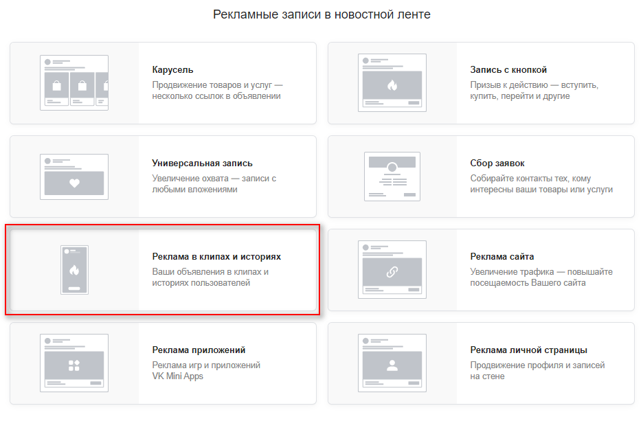 Как настроить: Чтобы разместить свою рекламу в «Клипах» достаточно при создании рекламы выбрать формат «Реклама в клипах и историях».