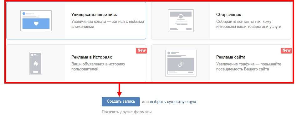 - В верхнем меню справа кликаем », в открывшемся окне жмем «Запустить рекламу» и попадаем на страницу создания нового объявления. В открывшемся меню выбираем «Универсальная запись», в конце страницы кликаем «Создать запись