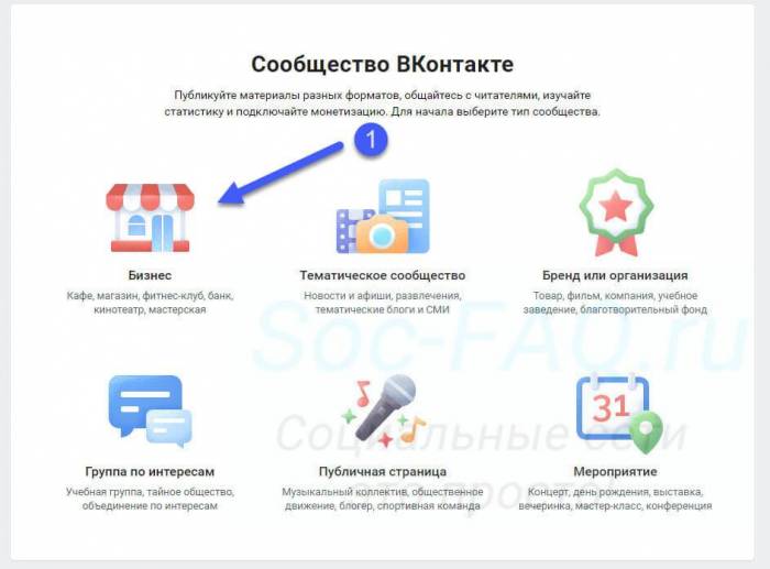 Теперь Вам необходимо выбрать подходящую категорию. В нашем примере, мы будем рекламировать оффлайн предприятие — поэтому выбираем вариант «Бизнес».