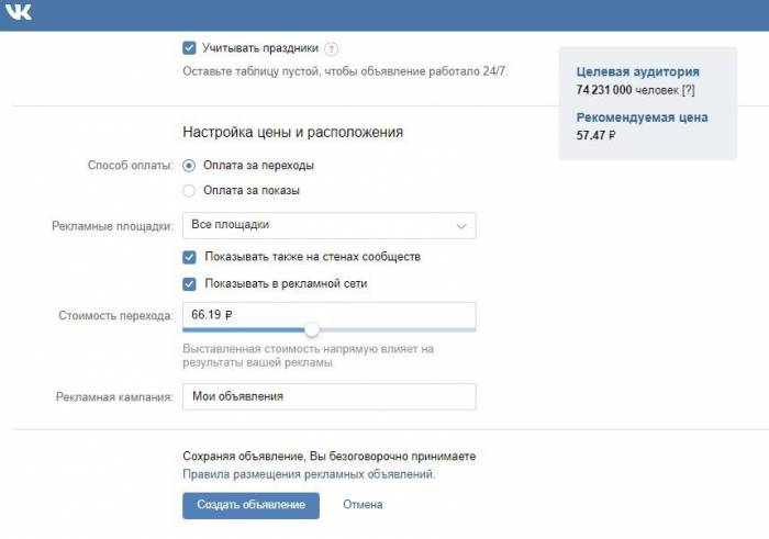 Когда вы создадите объявление в своем «Рекламном кабинете», вы можете настроить способ оплаты: