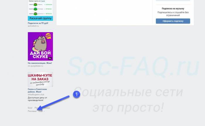 В правом меню найти «Реклама сообщества» и кликнуть на эту кнопку. Либо зайти также, как мы это делали в первый раз