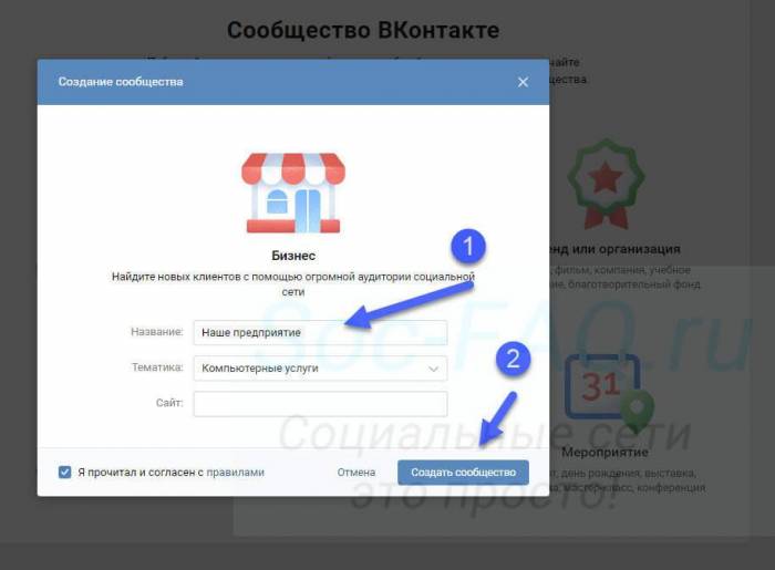 Дальше заполняем базовые настройки и нажимаем на кнопку «Создать сообщество».