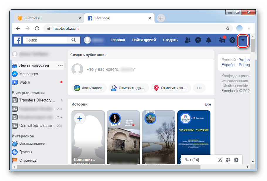 - Откройте главную страницу вашего аккаунта, для которого требуется создать рекламный кабинет. В правом верхнем углу нажмите на перевернутый треугольник.