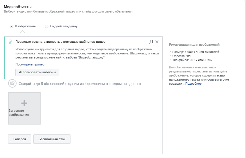 В медиаобъектах следует выбрать, что именно будет содержать рекламное объявление: изображение или видео/слайд-шоу.