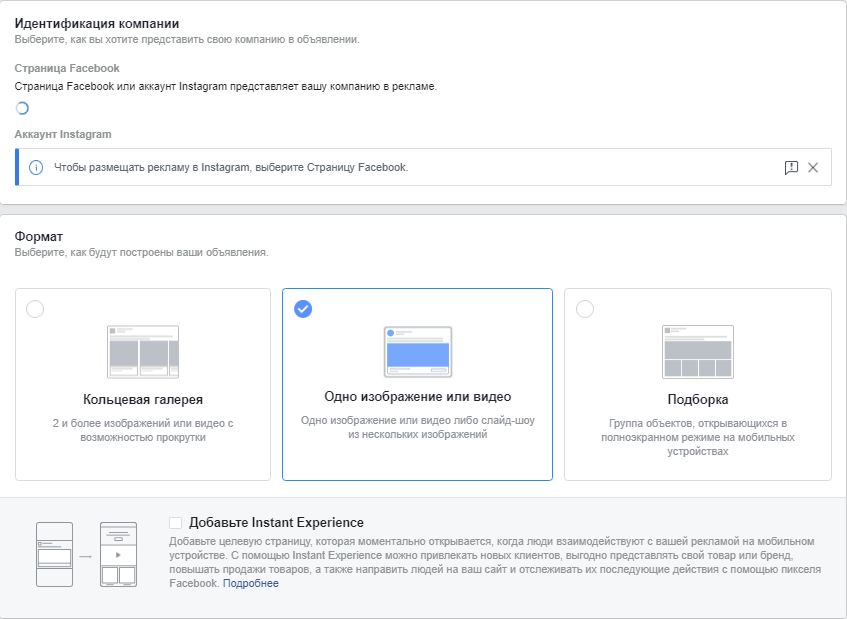 Настройка объявления состоит из: настройки формата, настройки медиаобъектов, а также, настройки ссылки.