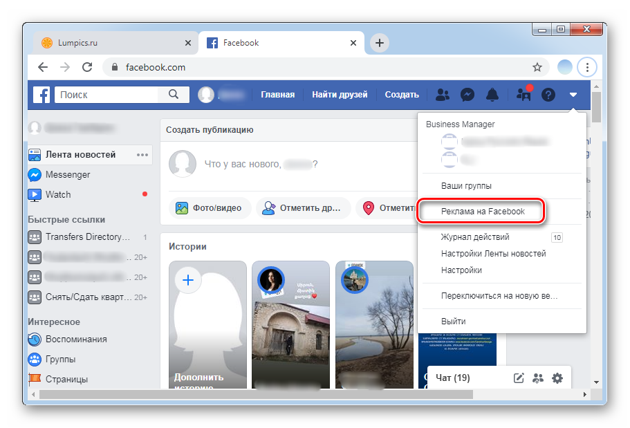 В верхней панели меню нужно выбрать пункт «Реклама на Facebook».