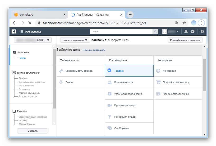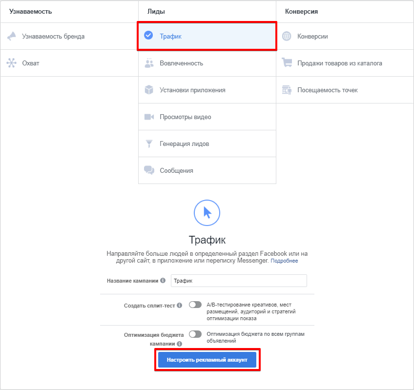 После выбора цели появляется возможность настройки рекламного аккаунта.