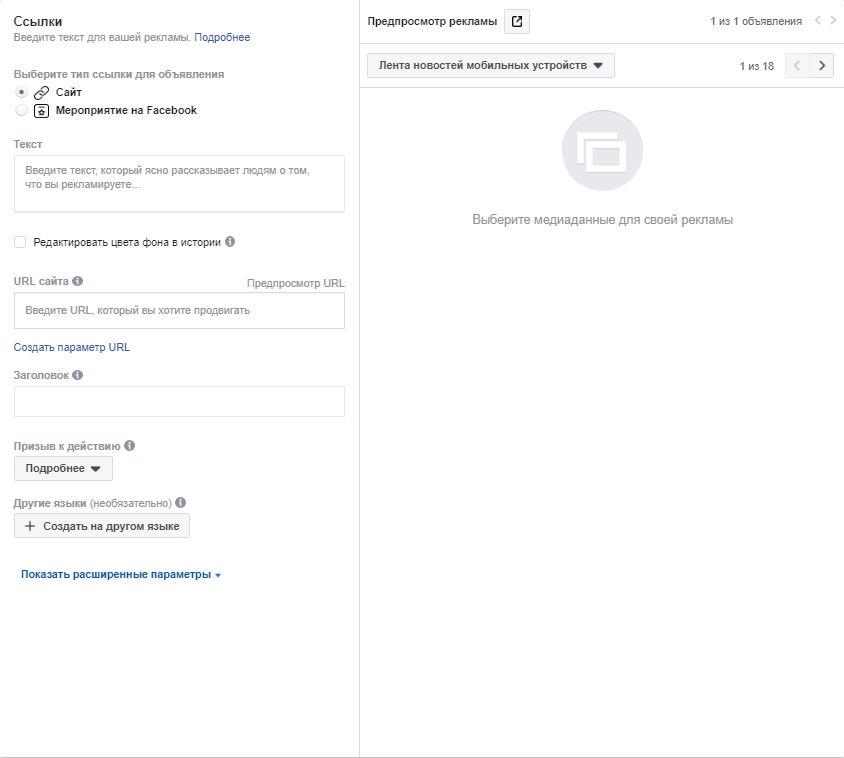 В разделе «Ссылки» указывается текст рекламного объявления, заголовок и URL сайта. Также, можно создать кнопку с призывом к действию.