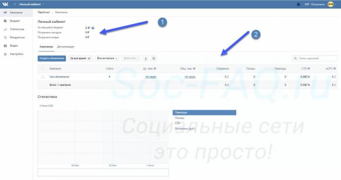 После того как будет создано хотя бы одно объявление, Ваш рекламный кабинет примет рабочий вид. Именно таким Вы будете теперь его видеть после открытия. На стартовой странице собрана основная статистика — траты бюджета и базовые показатели по существующим компаниям.
