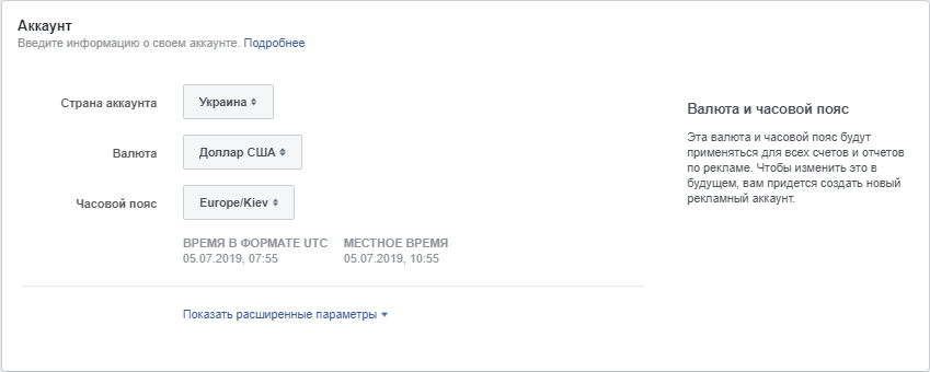 В настройках рекламного аккаунта следует указать страну, валюту, а также часовой пояс.