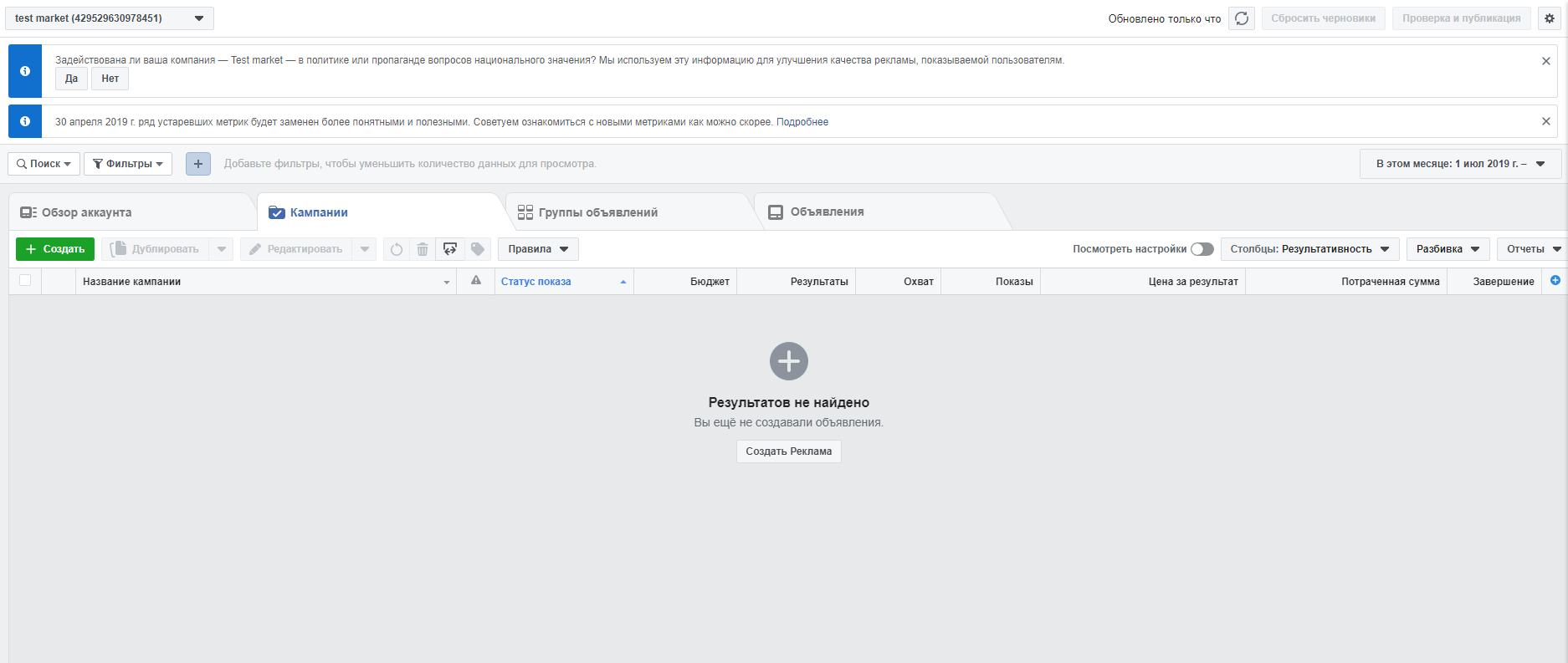 Далее на экране появляется главная страница вашего готового рекламного кабинета.