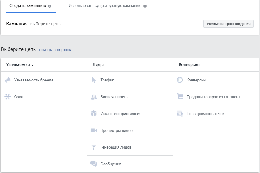 После принятия правил происходит перенаправление на страницу с созданием рекламной кампании.