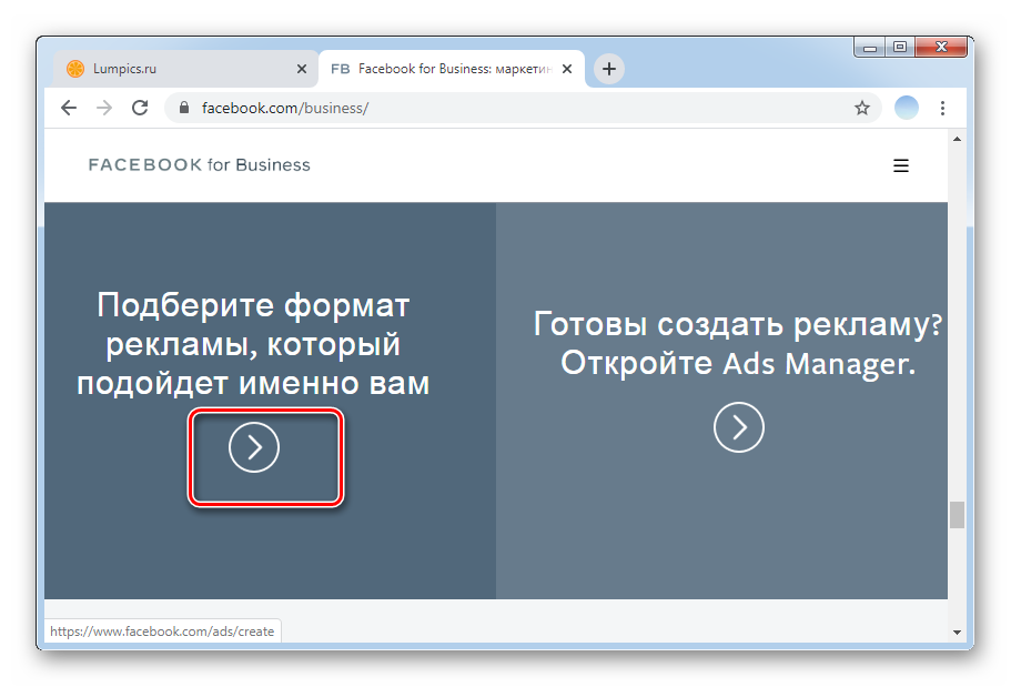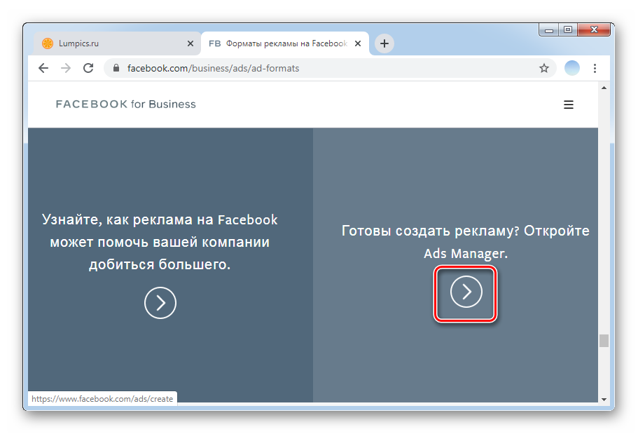После того как вы изучили вышеуказанный раздел, кликните по стрелочке под строкой «Откройте Ads Manager» — именно так называется рекламный кабинет на Фейсбук.