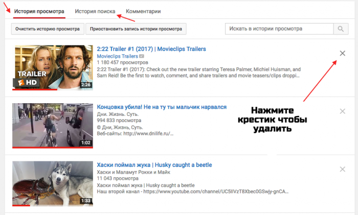 • При необходимости вы можете удалить отдельные просмотренные ролики или поисковые запросы.