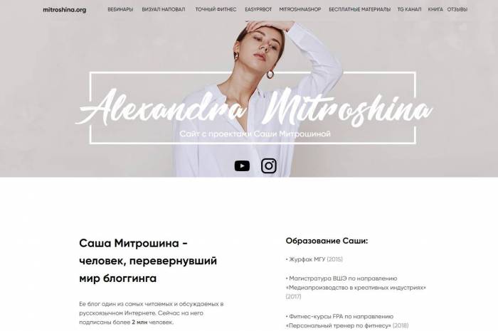 У девушки-блогера есть свой сайт. Там представлены все запущенные ею за последнее время проекты. К примеру, вебинары. Идея их проведения пришла в голову Саши давно. Она считает этот формат прекрасным вариантом для обучения нескольких людей одновременно. Ведь тогда отпадает необходимость одно и то же объяснять каждому.