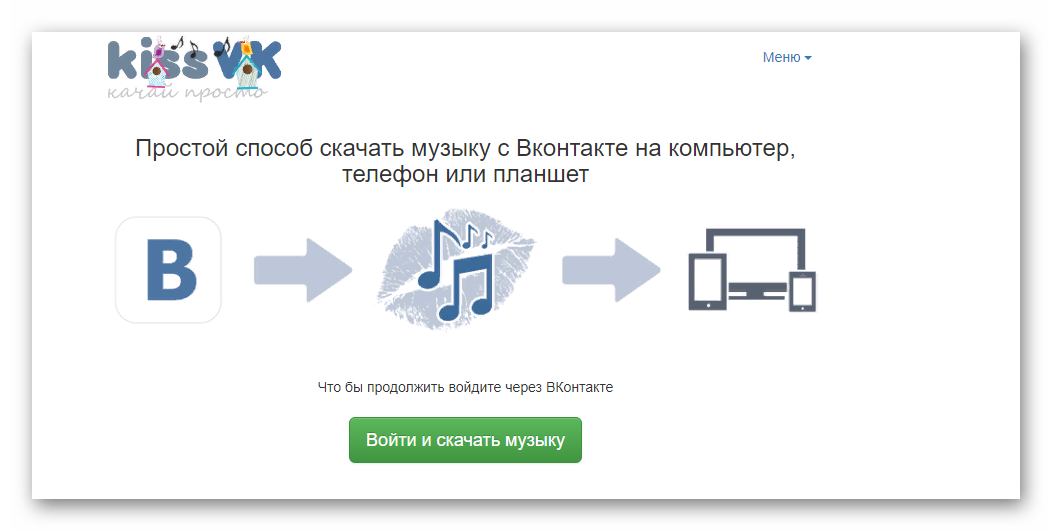 Портал http://kissvk.com/ не требует от пользователя установки софта на телефон или ПК. Просто дайте сервису доступ к вкладке «Моя страница» в ВК, и начинайте выкачивать аудиофайлы из социальной сети. Сайт работает на ПК и гаджетах под управление OS Android.