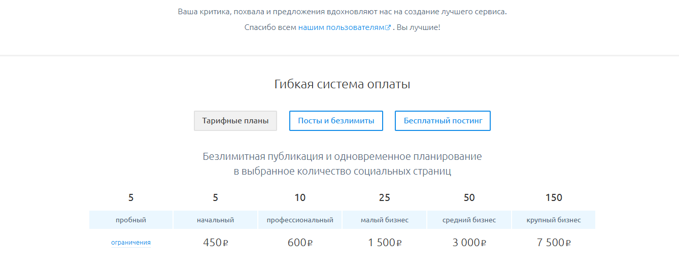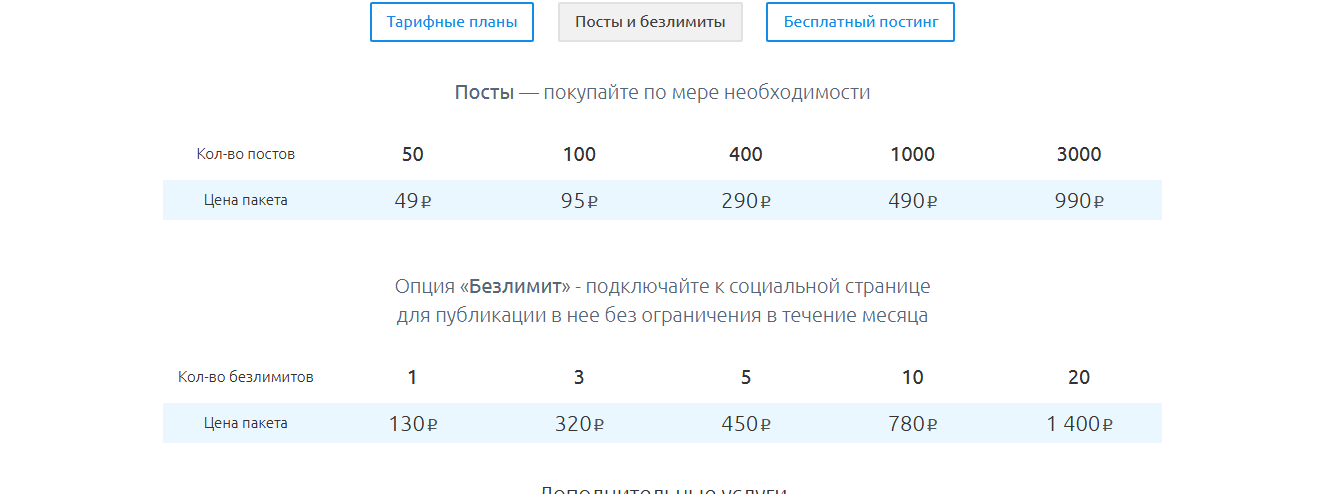 Цены: каждый месяц бесплатно добавляется – 50 постов. Есть бесплатный пробный период — 7 дней. Тарифные планы — от 450 до 7500 руб. в месяц.