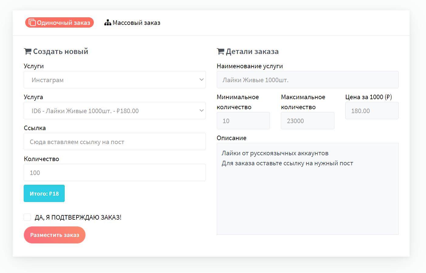 После этого оформляем заказ на накрутку подписчиков. Здесь действуем по следующей схеме: