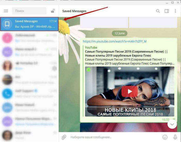 2. Чат — Избранное. Посылайте сообщения самому себе. Это ваше личное «облако», в котором будут храниться сообщения и файлы, отправленные с любого устройства.