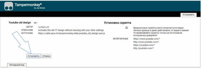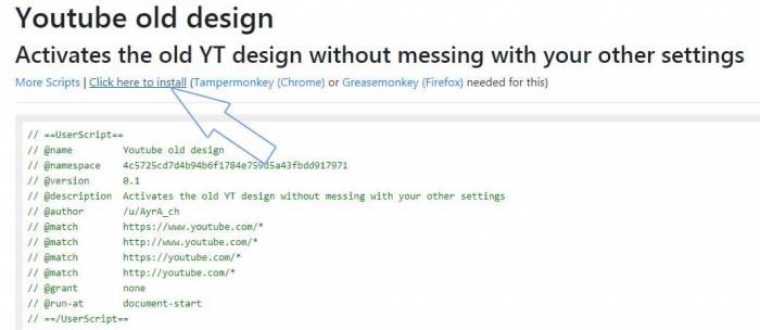 Перед тем, как вернуть старую версию ютуба, понадобится дополнительный скрипт, он доступен . Откройте скрипт, затем нажмите на ссылку «Click here to install», она находится сразу под шапкой заголовка. Далее произойдет автоматическая установка. Откройте ютуб, теперь он абсолютно обычный, в прежней версии.