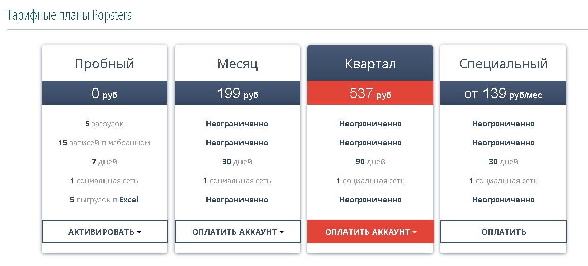 Popsters предоставляет на выбор 3 платных тарифа и один пробный. Оплату принимают через сервис Robokassa, для юридических лиц возможен безнал по предварительной договоренности.