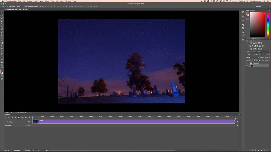 - Ваше видео появится на шкале таймлайн внизу экрана. Отсюда вы можете запустить предварительный просмотр, чтобы увидеть, как выглядит видео. Помните, что в первый раз оно может не воспроизводиться гладко, так как Photoshop по-прежнему воспроизводит файлы.