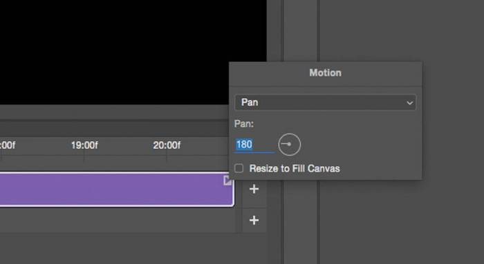 Обратите внимание, что там есть несколько вариантов, включая Панорамирование (Pan), Масштабирование (Zoom), Поворот (Rotate) и комбинации этих трех. Я выбрал Панорамирование, затем установил угол 180°, чтобы камера перемещалась слева направо