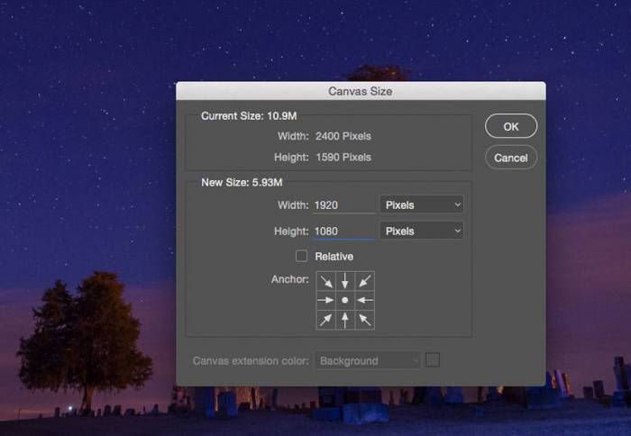 Поскольку в финальном видео мы будем перемещаться по кадру, нужно предоставить Photoshop пространство для маневров. Откройте меню Изображение (Image) и выберите Размер холста (Canvas Size). Появится окно, в котором будет показан текущий размер и способы его изменить. Скорее всего, по умолчанию пропорции будут указаны в дюймах, но я обычно устанавливаю пиксели. Нам нужно уменьшить размер холста примерно на 20%, чтобы вокруг него было место для смещения кадра. На примере ниже видно, что я экспортировал из Lightroom снимок, ширина которого равна 2400 пикселей. Размер холста был уменьшен до 1920 х 1080 пикселей. Это обеспечивает нам соотношение сторон 16:9, что идеально для просмотра на широкоэкранном ТВ или мониторе. Кликните ОК и заметите, что размер изображения на экране стал казаться меньше. Однако, сама фотография осталась прежней, мы всего лишь уменьшили участок просмотра (размер холста). Используя инструмент Перемещение (Move), вы можете смещать фотографию и увидеть, что слева, справа, сверху и снизу за чертой холста остались пиксели.