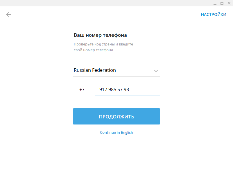 После запуска программы важно выбрать «Продолжить на русском», а не нажать «Start messaging». В противном случае Телеграмм будет на английском и придётся менять язык в настройках