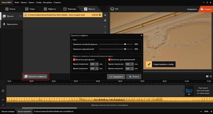 4. В разделе «Громкость и эффекты» настройте уровень основной музыки и озвучки. Также есть возможность изменить время появления композиции и затухания.