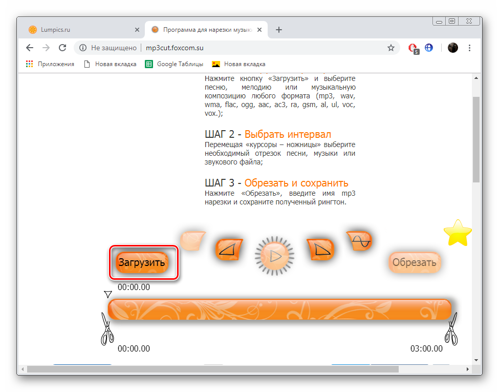 - Откройте главную страницу MP3cutFoxcom и приступайте к загрузке дорожки.