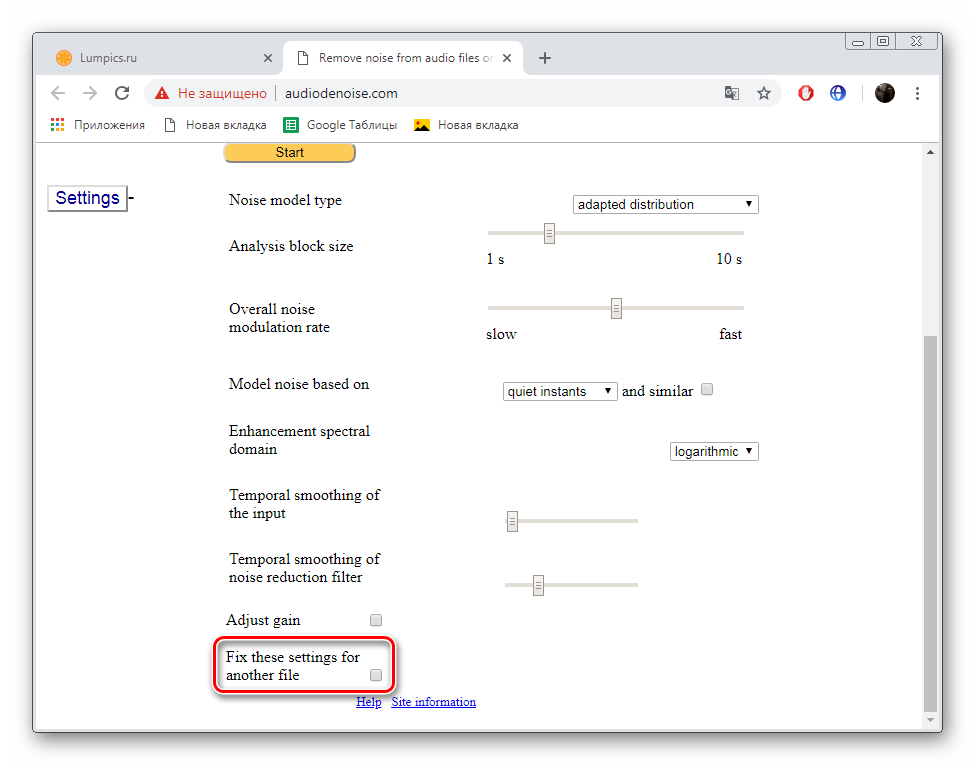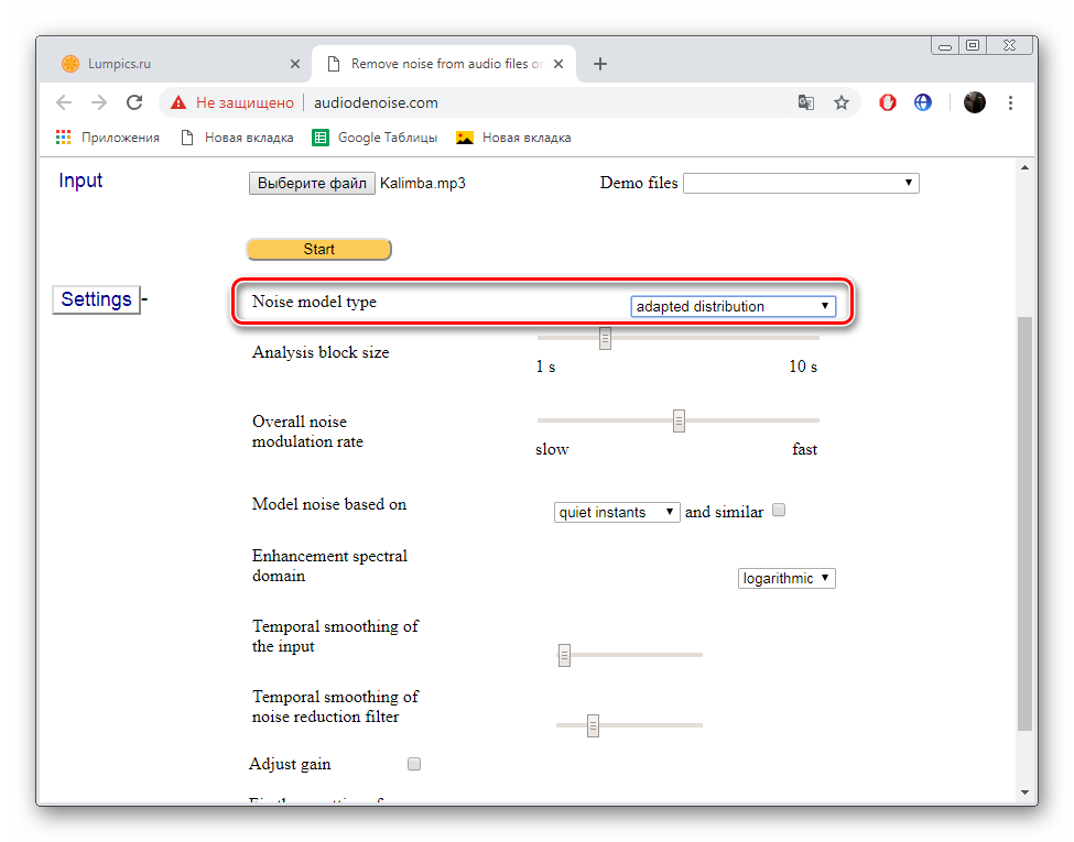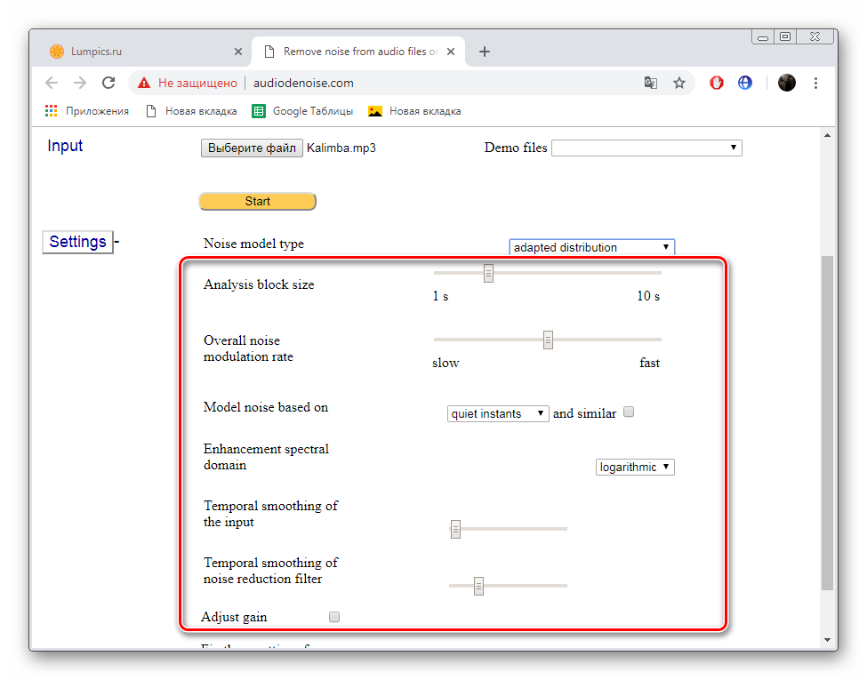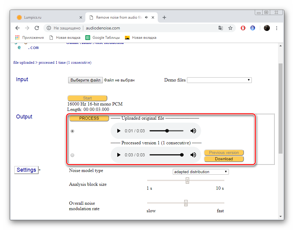 На этом работа с Online Audio Noise Reduction окончена. Как видите, в его функциональность входит детальная настройка удаления шумов, где пользователю предлагают выбрать модель помех, задать параметры анализа и выставить сглаживание.