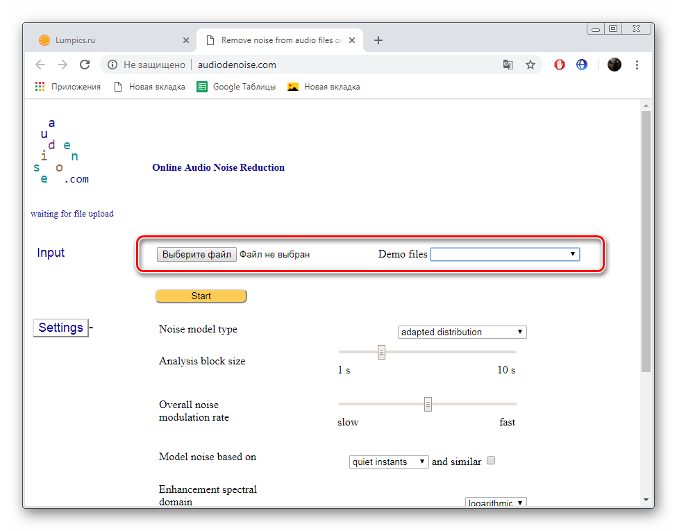 - Откройте Online Audio Noise Reduction, воспользовавшись указанной выше ссылкой, и сразу переходите к загрузке музыки или выберите один из готовых примеров, чтобы проверить работу сервиса.