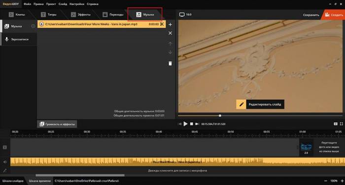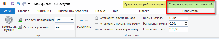 Новая звуковая дорожка автоматически прикрепится к видеоряду. Чтобы настроить громкость, скорость и другие параметры звука, необходимо перейти во вкладку меню «Средства для работы с музыкой«, которая появится сразу после добавления новой аудиозаписи.