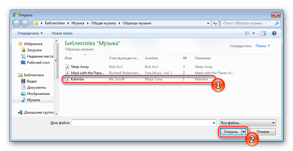 В открывшемся обозревателе выделите левой кнопкой мыши необходимый трек, а затем щелкните на «Открыть».