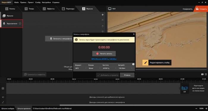 3. Наложить голос на видео можно с помощью меню «Звукозаписи». Вы можете использовать встроенный микрофон и настроить параметры аудио: формат, режим, частоту, битрейт. После завершения записи она будет сохранена на компьютер и добавлена в проект.