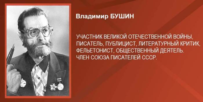 Автор — Владимир Сергеевич Бушин, участник Великой Отечественной войны, писатель, публицист, литературный критик, фельетонист, общественный деятель. Член Союза писателей СССР.