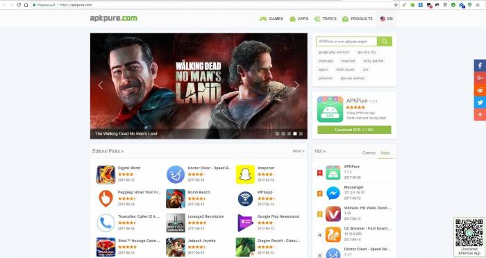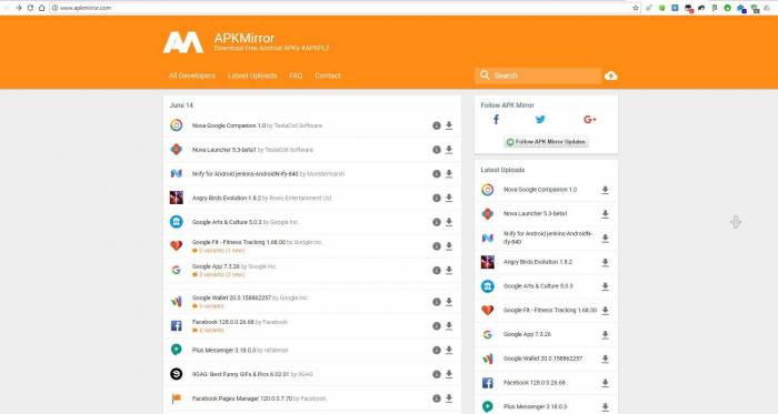 Apkmirror.com и apkpure.com — более известные сайты с аналогичной, но расширенной функциональностью. APKMirror — любимый файлообменник сайта Android Police. На странице для скачивания содержится название пакета, номер версии, минимальные требования к версии Android. Для скачивания доступны предыдущие версии приложений, а главная страница содержит ленту последних загрузок, а также статистику наиболее популярных приложений по результатам загрузок за 24 часа, семь дней и месяц.