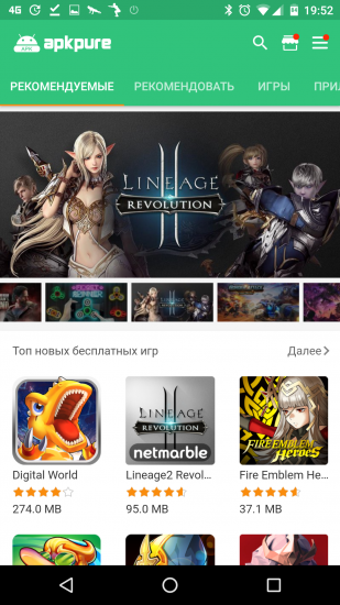 APKPure имеет более яркий дизайн с главной страницей, рекламирующей в основном игры. Сайт также позволяет скачивать предыдущие версии приложений.