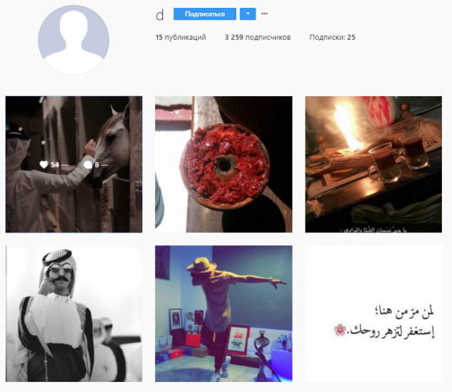 d — «صباح الخير ي حلوين ..» или «Доброе утро, возлюбленная» — вот что написано в последнем посте у профиля арабского пользователя под буквой D. В профиле арабские мотивы и всего 15 постов, первый из которых был опубликован 9 августа 2017.