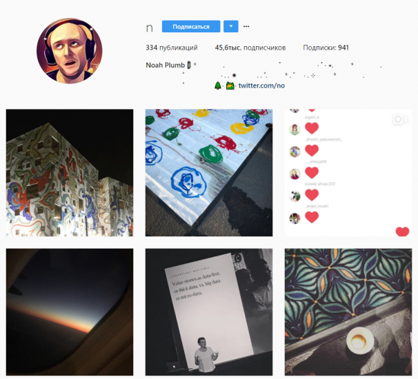 n — мало того, что он отхватил себе @n в Instagram, так у него ещё и в имя профиля в Twittter кому он вообще нужен теперь? — @no. В остальном странный профиль. Есть фотографии прям ваааах, красота минимализма/концентрации на объекте, но большая часть объективная хрень.