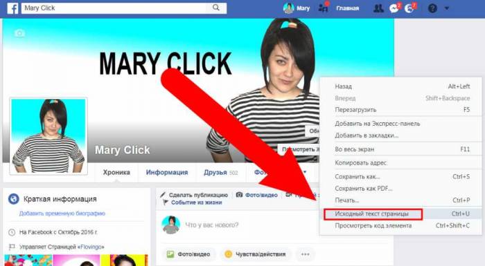 Затем откройте свой Facebook аккаунт. Чтобы получить доступ к исходному коду своей странички быстро и просто, нужно щелкнуть на свое имя в левом углу сверху под картинкой аккаунта.